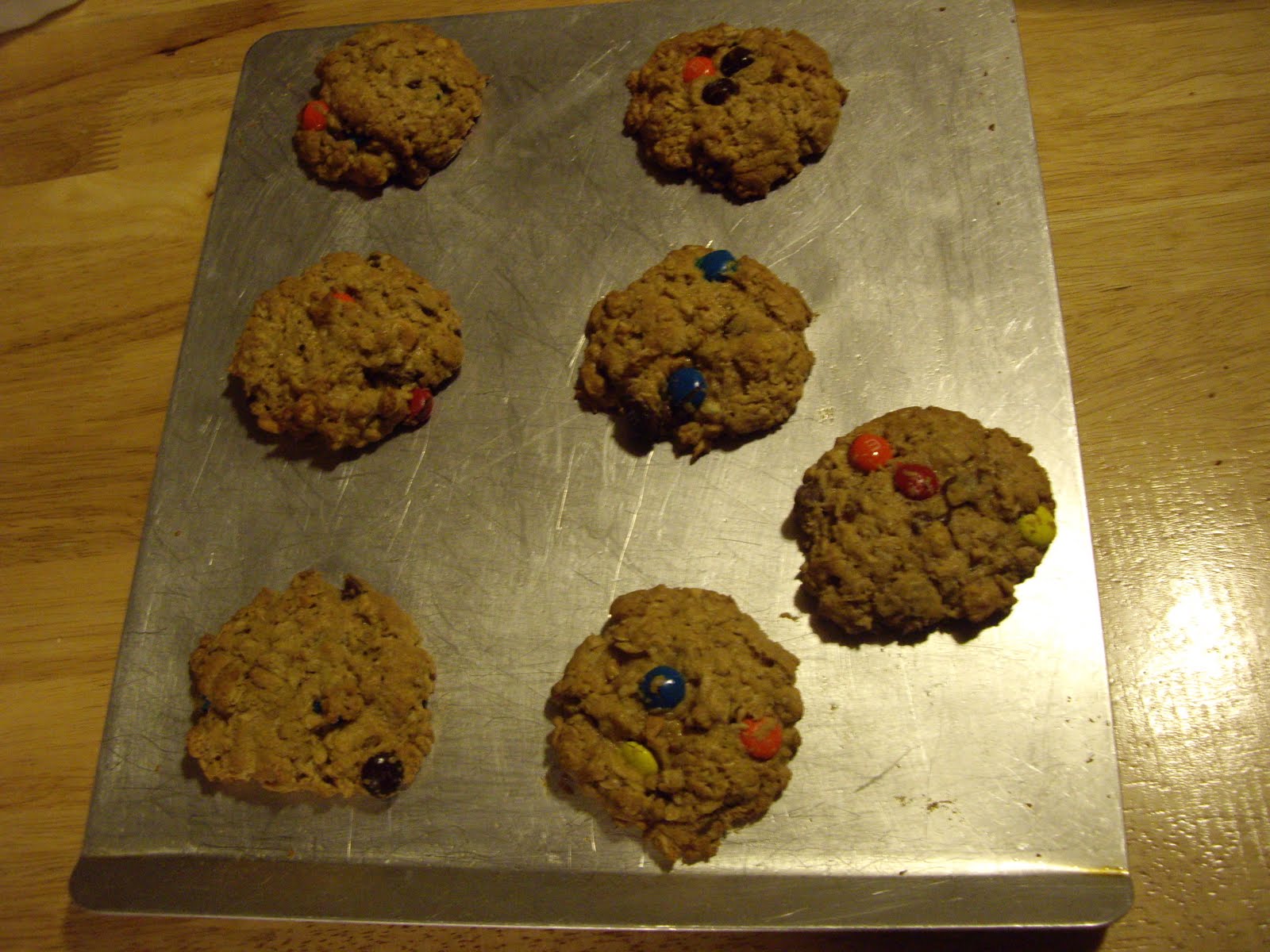 Combine eggs, sugars, vanilla, corn syrup, baking soda, and salt. Stir in the melted butter. Add the peanut butter, oatmeal, and flour mixing until thoroughly combined. Stir in the chips and m&ms. Let the dough rest for 30 minutes so the oatmeal can absorb some of the butter.