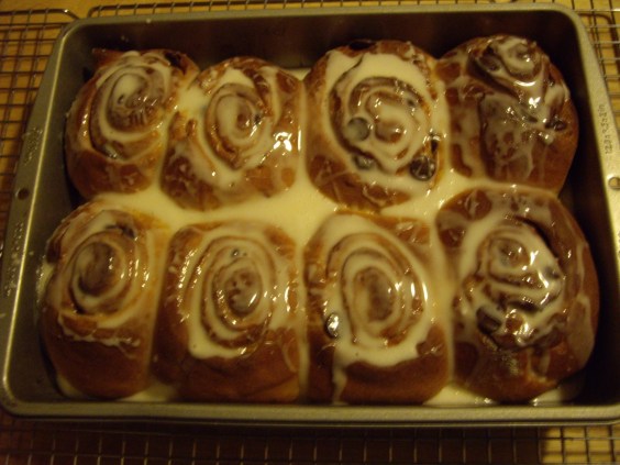 Spoon the glaze evenly over the warm cinnamon rolls.