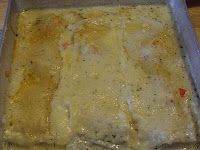 You will need an 8″ x 11″ greased baking dish. A 9″ x 13″ cake pan will also work. It will just be a little thinner.