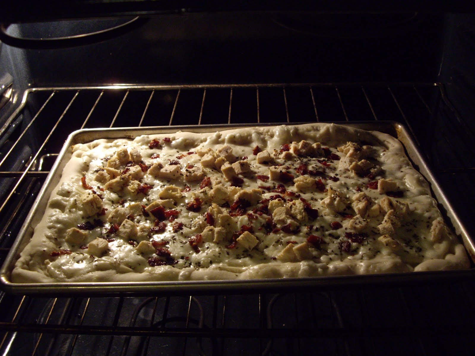 Pour half of the sauce into the baking pan. Top with the chicken. Add whatever you want for additional toppings. Cover with the rest of the sauce and sprinkle the cheese over the top.