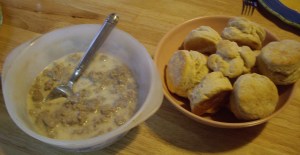When the sausage is all browned and the liquid in the pan is bubbling, push the sausage to the sides of the pan and pour the milk/flour mix into the skillet.